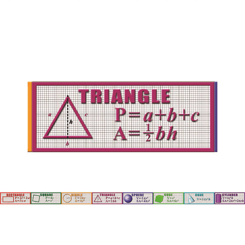 This colorful, informative border decorates as it helps students learn basic geometry formulas. It shows common two-dimensional and three-dimensional shapes along with their formulas for perimeter, area, circumference, volume, and/or surface area.