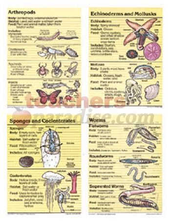 Package includes 4 reproducible activity sheets, a teacher’s guide, and 4 sturdy 17″ x 22″ posters with the following titles: Arthropods; Worms; Echinoderms and Mollusks; and Sponges and Coelenterates. Science.