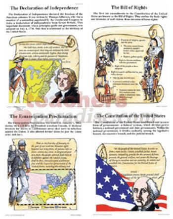 Package includes 4 reproducible activity sheets, a teacher’s guide, and 4 sturdy 17″ x 22″ posters with the following titles: The Emancipation Proclamation, The Bill of Rights, The Declaration of Independence, and The Constitution of the United States. Social Studies.