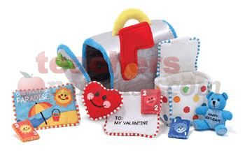 All of your toddler’s mail will be sealed with a kiss with this soft, plush mailbox set! The mailbox has a working door and flag, and a see-through back panel. The set includes envelopes, removable stamps, a flip-top box, plush bear “present” and more!