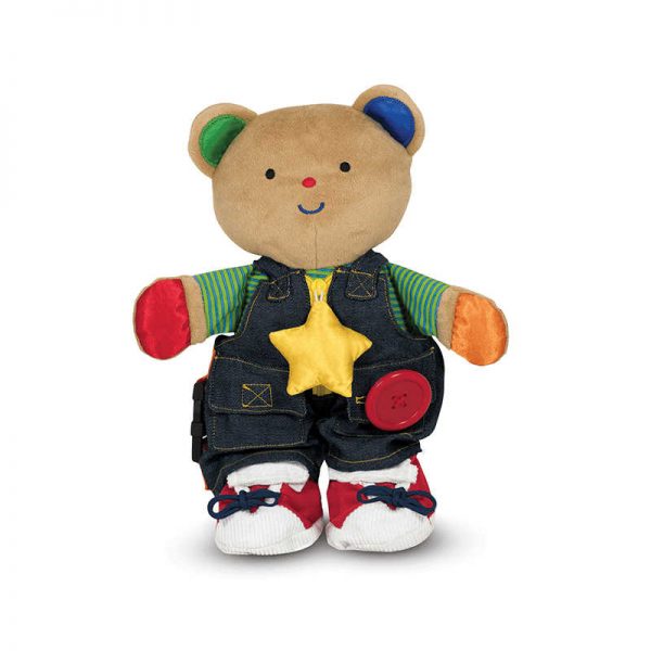 Toddlers and preschoolers learning the basics of self care and refining grasp and hand-eye coordination have met a cuddly match for their emerging skills! Adorable plush bear Teddy Wear comes clad in a removable outfit packed with closures–perfect for testing a little one’s growing problem-solving and motor skills. Buttons, zippers, self-stick tabs, buckles, and laces will keep fingers working on a number of different levels, offering a beneficial mix of encouragement and challenge. A mix of textures adds lots of sensory input too, making this a terrific toy for kids of all abilities!