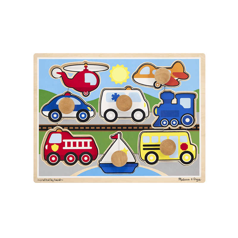 Eight big pieces with oversize knobs make this the perfect first puzzle! The bright, cheerful artwork features a collection of favorite vehicles in the air, land, and sea. Each one has its own illustrated well in the sturdy wooden puzzle board, encouraging young children to match the pictures, maneuver the pieces, and build important fine-motor and cognitive skills through play.