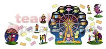 This bulletin board features Ferris wheel, 33 tickets, and 7 carnival accents. Use the Ferris wheel as a job chard, a graphing tool, a clock, and much more by placing the tickets in the die-cut wheel cars. Includes a four-page teacher guide with reproduceibles.