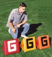 Eleven shot-weighted base markers with Velcror fasteners… Nylon-reinforced vinyl with pliable foam-filled sides… Folds flat for storage…Made of non-mildewing vinyl with foam inserts and Velcror closures… Weighted bottoms help prevent movement in wind… Collapse on impact for player safety & fold flat for storage…2 markers for each yardline and 1 fifty yardline marker…All markers come in yellow, red, or orange with black or white screen printed numbers on both sides…Specify colors when ordering …UPS.