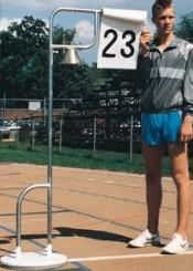 Intern’l, European and Olympic races signify last lap by bell …Vinyl numbers can be flipped over… Keeps up to 24 laps… Reversible numbers… Upper unit -1″ dia. galvanized steel tube mounted on an 18″ dia. base… Some assembly, UPS