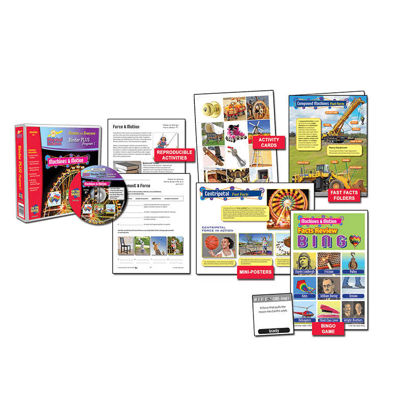 Students will gain an understanding of how different kinds of forces produce motion. Photographs, illustrations, and diagrams clearly show how simple machines come together to create compound machines and how flight has evolved over the centuries. Supports physical science curriculum for grades 4 and up. Topics include forces (magnetic, gravity, friction, etc.), simple machines, compound machines and early and modern day flight. Contents include facts review Bingo game, 3 fast facts folders, 14 fast facts mini-posters, 60 photo activity cards, 70 facts sheets and activity pages and a whiteboard-ready CD.