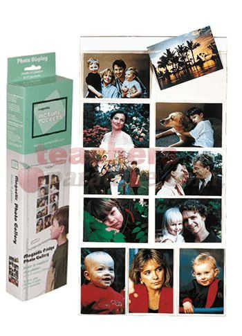 Holds 11 photos in a neat Picture Pocket directly on the fridge using the top white magnetic strip to securely hold to the fridge.