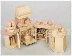 Furniture and accessories meet the highest standards of quality workmanship, durability and safety in design. Furniture drawers and cabinet doors actually open for added play value. All pieces are made from replenish able rubber wood with non-toxic paint. Ages 3 and up. Four-piece set includes range, sink, and 2 counter units. Range measures 21/4inches wide x 6inches high.