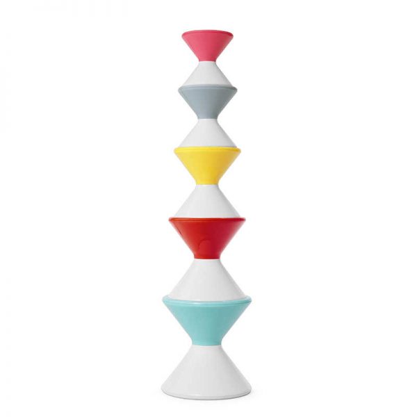 Five hourglass shaped cones stack high to create fun, vibrantly colored geometric towers. Designed for small hands, each coned piece can be turned on its side to allow toddlers to push and roll, exercising fine and gross motor skills.