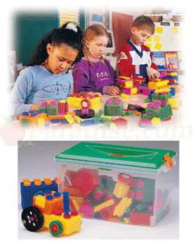 4 large, 8 medium, and 12 small bricks, plus 2 large wheels, 8 color wheels, 22 square tiles, 22 rectangular tiles, 22 blocks, and a clear, plastic storage container. An illustrated leaflet with model construction ideas is included. Related Categories: Construction – Interstar