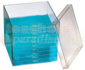 A perfect cubic decimeter box which contains exactly one liter. The remarkable relationship in the metric system between linear, volume and mass is readily demonstrated by using the liter box. Calibrated in 100 mL intervals. Lid is included. Related Categories: Volume