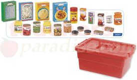 Set of 21 canned foods, jars, milk and fruit juice cartons, and other similar cartons, packed in a plastic storage container. Related Categories: Food