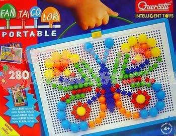 Includes 280 pegs in 3 sizes (10, 15, 20 mm) and 6 colors, plus storage case with locking pegboard (28 x 20 cm). Ages 4 . Packed in illustrated box with many examples to copy.