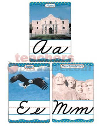 This unique cursive alphabet set features 26 durable letter cards with beautiful color photos of American symbols and places, such as F for flag, S for Statue of Liberty, and W for White House. Display as an alphabet frieze, or use as independent letter cards, or even social studies discussion prompts! 26 5-7/8″ x 8-1/2″ full-color cards plus teaching tips each card: 5-7/8″ x 8-1/2″ Grades 2-5