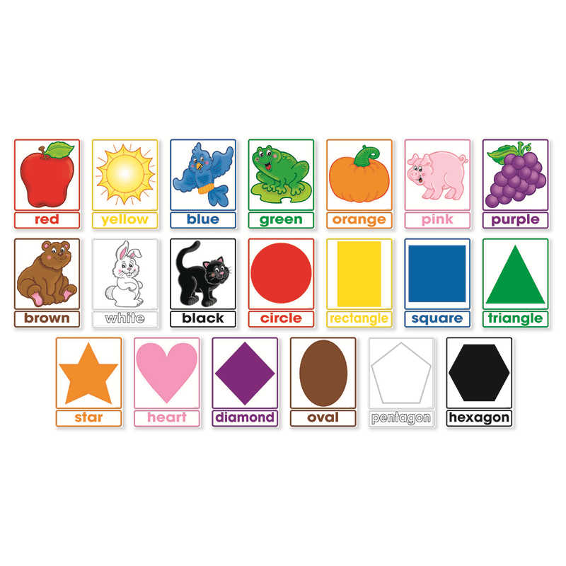 Create excitement in your classroom with these big, bright cards that teach color and shape recognition! Covers 10 colors (red, blue, yellow, orange, purple, green, pink, brown, black, and white) and 10 shapes (circle, square, triangle, rectangle, oval, diamond, heart, star, pentagon, and hexagon) in addition to their corresponding word cards. Supports the Common Core State Standards.