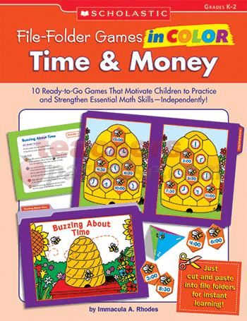 Colorful, time-saving, and a snap to set up and store, these fun and engaging file-folder games encourage independent learning. Just glue the brightly-colored game boards inside file folders, and students will have everything they need to play games that help them learn and practice early time and money skills. Topics include units of time (time of day, days, months); telling time (to the hour, half-hour, quarter-hour), adding time in increments; matching coins to values; adding money; sorting coin combinations; and much more. Perfect for learning centers!