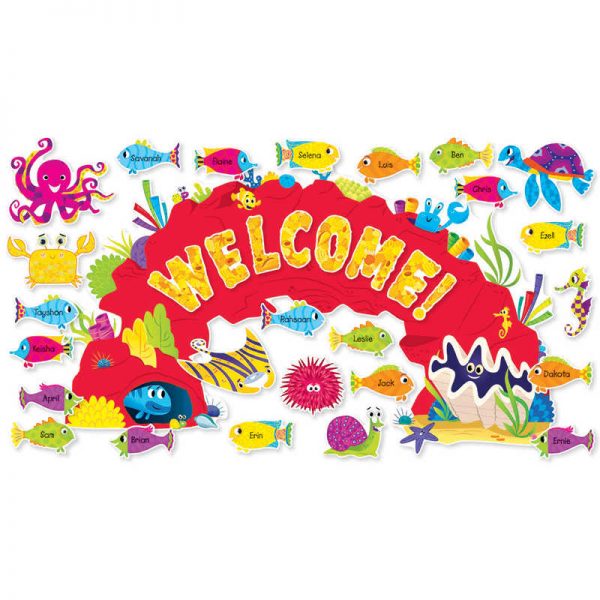 Greet students and visitors to your classroom with this bright, colorful bulletin board set. Spell out WELCOME! or write another message of your choice. Includes ocean creatures and a variety of write-on/wipe-off fish to personalize with students’ names. Teaching activities support the Common Core State Standards.