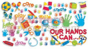 Celebrate children’s accomplishments with this bulletin board that includes 30 colorful handprints, plus 14 accent pieces and 6 action words that show just what kids can do! Includes an “Our Hands Can” banner and an activity guide.