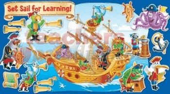48 pieces: large explorer’s ship (approximately 36″ x 24″), 7 animal sailors: walrus, hammerhead shark, sea otter, parrot, seagull, sea turtle, and octopus, steering wheel, map, compass, and anchor, 34 spyglasses, 2 banners (one blank), activity guide 18 x 24