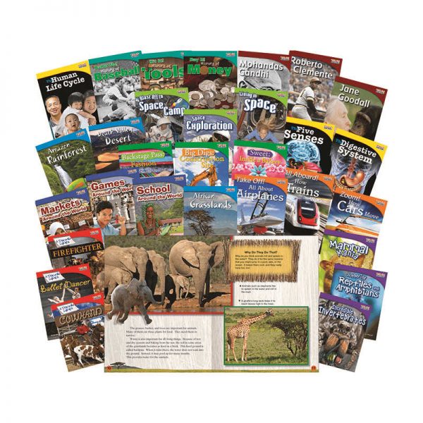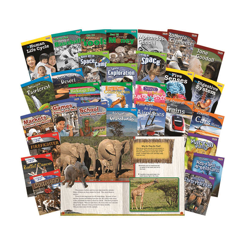 Learn about fun and exciting games from different parts of the world, step into a ballet dancer’s shoes to experience a day in their life, and more with this 30-book collection. Supplement your reading program, build your classroom library, and enhance your intervention program with high-interest nonfiction leveled books. These colorful books feature content from TIME FOR KIDS?, with themes from science, mathematics, and social studies. Children will want to read these books that include familiar concepts, high-interest content, and a variety of colorful graphics. The titles in this collection include: A Day in the Life of a Cowhand; A Day in the Life of a Ballet Dancer; A Day in the Life of a Firefighter; Markets Around the World; Games Around the World; School Around the World; Take Off! All About Airplanes; All Aboard! How Trains Work; Zoom! How Cars Move; Mammal Mania; Slithering Reptiles and Amphibians; Incredible Invertebrates; Backstage Pass: Fashion; Big Digs: Construction Site; Sweet: Inside a Bakery; African Grasslands; Amazon Rainforest; Death Valley Desert; Blast Off to Space Camp; Space Exploration; Living in Space; The Five Senses; The Digestive System; The Human Life Cycle; Batter Up! History of Baseball; Hit It! History of Tools; Buy It! History of Money; Mohandas Gandhi; Roberto Clemente; and Jane Goodall.