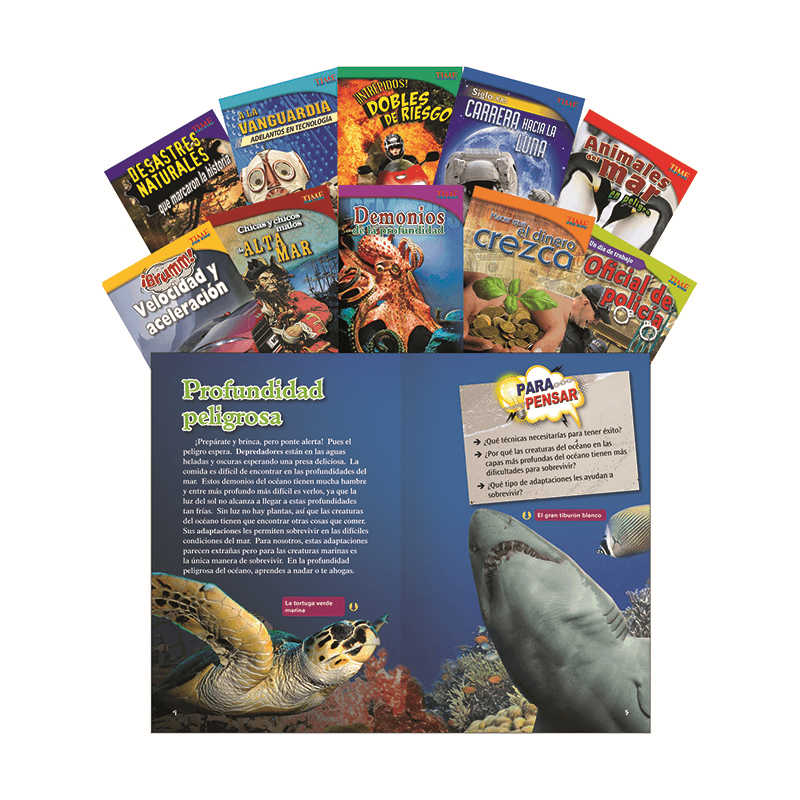 Do you know how to spot a pirate or make your money grow? These are but two of the many nonfiction topics featured in this fun and entertaining Spanish set. You’ll explore underwater creatures, natural disasters, and much more with engaging layouts, conversational-style text, and plenty of sidebars. This titles in this collection include: Demonios de la profundidad (Demons of the Deep); Siglo XX: Carrera hacia la Luna (20th Century: Race to the Moon); Chicas y chicos malos de alta mar (Bad Guys and Gals of the High Seas); Un d?a de trabajo: Oficial de polic?a (All in a Day’s Work: Police Officer); Hacer que el dinero crezca (Making Money Grow); Animales del mar en peligro (Endangered Animals of the Sea); ?Brumm! Velocidad y aceleraci?n (Vroom! Speed and Acceleration); ?Intr?pidos! Dobles de riesgo (Fearless! Stunt People); Desastres naturales que marcaron la historia (Unforgettable Natural Disasters); and A la vanguardia: Adelantos en tecnolog?a (The Cutting Edge Breakthroughs in Technology.)