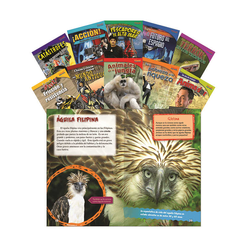 Find out what it takes to make a movie or what makes a real-life catastrophe so unforgettable with this engaging Spanish set featuring challenging nonfiction text. Content-area themes include such topics as the future of space, endangered jungle animals, and what it takes to be an animator. Book features include awe-inspiring photos, graphs, sidebars, and thought-provoking questions. Titles in this collection include: Terror en los tr?picos (Terror in the Tropics); Siglo XXII: El futuro del espacio (22nd Century: Future of Space); Chicas y chicos malos del mundo antiguo (Bad Guys and Gals of the Ancient World); Un d?a de trabajo: Animador (All in a Day’s Work: Animator); De la pobreza a la riqueza (From Rags to Riches); Animales de la jungla en peligro (Endangered Animals of the Jungle); ?Fsst! Fricci?n y resistencia (Drag! Friction and Resistance); ?Capturas peligrosas! Pescadores de alta mar (Dangerous Catch! Deep Sea Fishers); Cat?strofes que marcaron la historia (Unforgettable Catastrophes); and ?Acci?n! Filmando pel?culas (Action! Making Movies.)
