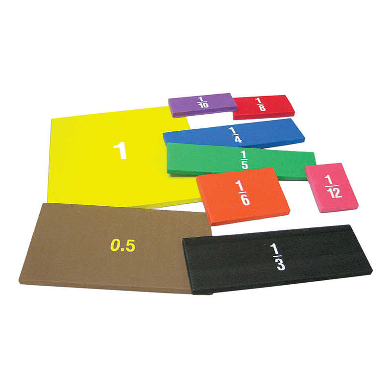 Learn about common fractions and their decimal equivalents. Nine color-coded squares representing 1 whole, 1/2, 1/3, 1/4, 1/5, 1/6, 1/8, 1/10, and 1/12. Decimal equivalents are on the back. Foam is lightweight, soft, quiet, and washable. Comes in a resealable storage bag. Teaching tips are included.