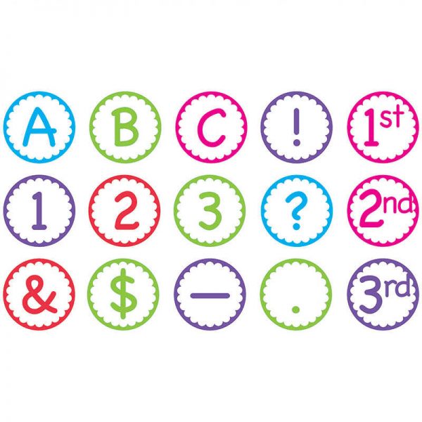 Accessorize your classroom with these adorable 3-1/2″ Circle Letters! Add them to pennants, word walls, and displays to create your own message with a unique look. Includes 162 letters, 54 numerals, ordinal numbers, and punctuation pieces. 216 total piece
