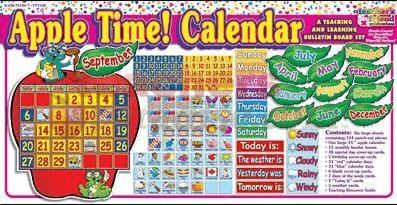 Apple Time Calendar This calendar bulletin board set includes one large 24″ apple calendar with 12 monthly header leaves,38 special day cover-up cards, 5 birthday cover-up cards, 22 “red” calendar days, 33 “blue” calendar days, and 6 blank cover-up cards. 7 Days of the Week cards and additional weather cards are also included in the set. The reproducible teaching resources guide includes curriculum related ideas and activities and useful patterns.