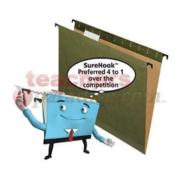 SureHook? features revolutionary built-in tension springs. Rods bend less and folders stay on rails and slide with ease. Rods and hooks are stronger and work with existing filing systems. Superior durability with reinforced polylaminated top and bottoms. Dispenser box for easy one at a time access. Includes clear tabs and letter size printer ready insert sheet. Contains 10% recycled fiber with 10% post consumer fiber. SFI Certified. Acid free. Lifetime Guarantee. Standard Green. 20/Box.