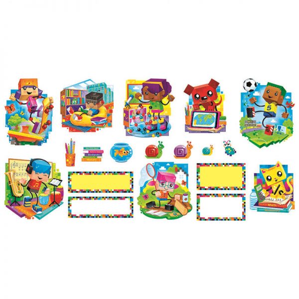 Soar to success! Explore everyday learning, introduce diversity, and spark interest in the world around you. Inspire kids to shine in learning and life. Includes 8 blank signs, 6 kids, a dog, a cat, and 7 whimsical theme decorations. 23 pieces, up to 13 3/4″. Coordinates with BlockStars!? Collection.