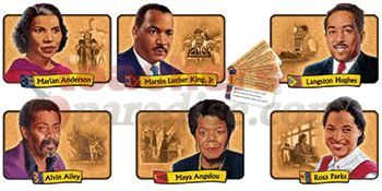 Portraits of leaders are accented by African textile patterns: Alvin Ailey, Marian Anderson, Maya Angelou, Mary McLeod Bethune, Bill Cosby, Florence Griffith-Joyner, Langston Hughes, Jesse Jackson, Mae C. Jemison, Martin Luther King, Jr., Jesse Owens, and Rosa Parks. Includes fact cards and a detailed Discovery Guide.