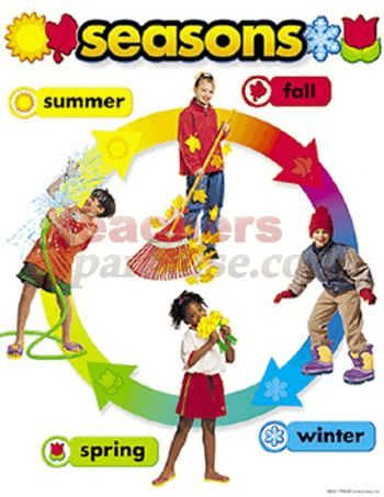 Pictures of children in clothing appropriate in a variety of seasons. All are situated in a circular pattern on the chart with the labels for each season. Back of chart features reproducible activities, subject information, and helpful tips. 17″ x 22″ classroom size.