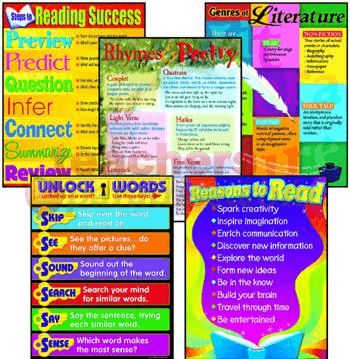 This five-chart pack for Grade 3 to Grade 5 includes: Steps to Reading Success (T-38286), Rhymes & Poetry (T-38045), Unlock Words (T-38283), Reasons to Read (T-38284), and Genres of Literature (T-38044).
