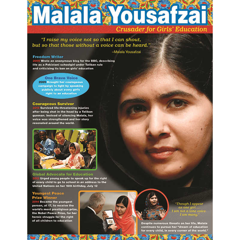Meet Malala Yousafzai, the young Pakistani crusader for girls’ education rights. Extra Value: timeline and activity reproducibles on back. Durable. 17″ x 22″.