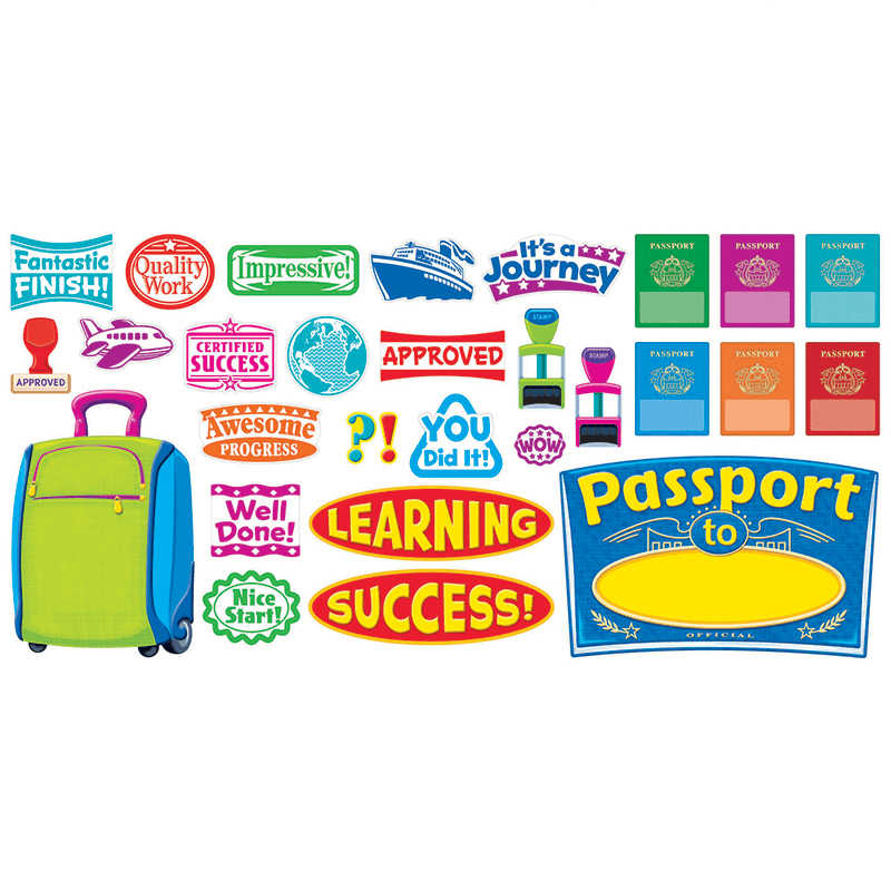 Let your imagination soar! This multi-use set has endless possibilities. Explore history, geography, science, math, writing, and more. Reward students for learning achievement or good citizenship with words of praise in their own passport to learning. Includes 36 passports in 6 colors, 11 praise words, 3 punctuation marks, 3 stampers, 12 1/2″ x 19 1/2″ passport header with 2 inserts, ship, plane, globe, and 11 1/2″ x 17″ suitcase. 60 pieces.
