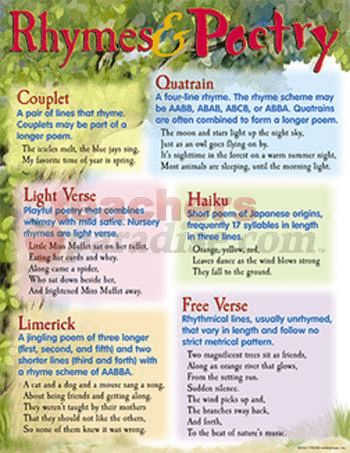 Chart shows different types of poetry with samples and definitions of each. Back of chart features reproducible activities, subject information, and helpful tips. 17″ x 22″ classroom size.