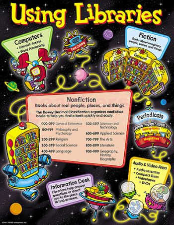 A list of reference materials commonly found in school or public libraries, and the things that can be found in them. Back of chart features reproducible activities, subject information, and helpful tips. 17″ x 22″ classroom size.