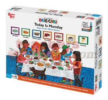 Match food to collect cards while learning the days of the week! Based on Eric Carle’s Today is Monday book, this game teaches children the days of the week in a fun, interactive way. Each day is represented by a different food and children use their memory skills to flip cards from the center of the board to see if they match. When players have collected one food for every day, they practice saying the days of the week in the correct order. Children practice their concentration, memory and decision-making skills, all while learning the days of the week!For 2 – 4 players, ages 3 and up.Contents Include: 56 Days of the Week Food Cards, 1 Game Board and instructionsMade in the USA