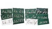 15 double-sided cards, 7″ x 15″ (18cm x 38cm), over 18′ long. White side includes line art drawing representing letter sound in initial position. Plus 2 cards with numerals. Cursive