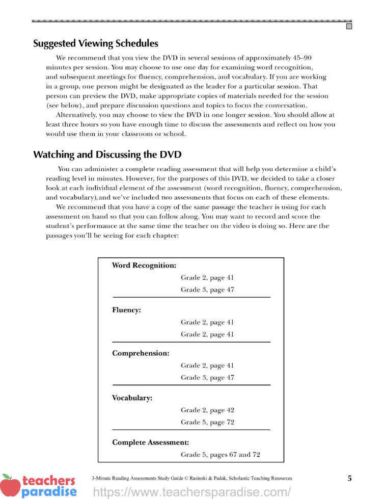 We recommend that you view the DVD in several sessions of approximately 45–90 minutes per session. You may choose to use one day for examining word recognition, and subsequent meetings for fluency, comprehension, and vocabulary. If you are working in a group, one person might be designated as the leader for a particular session. That person can preview the DVD, make appropriate copies of materials needed for the session (see below), and prepare discussion questions and topics to focus the conversation.