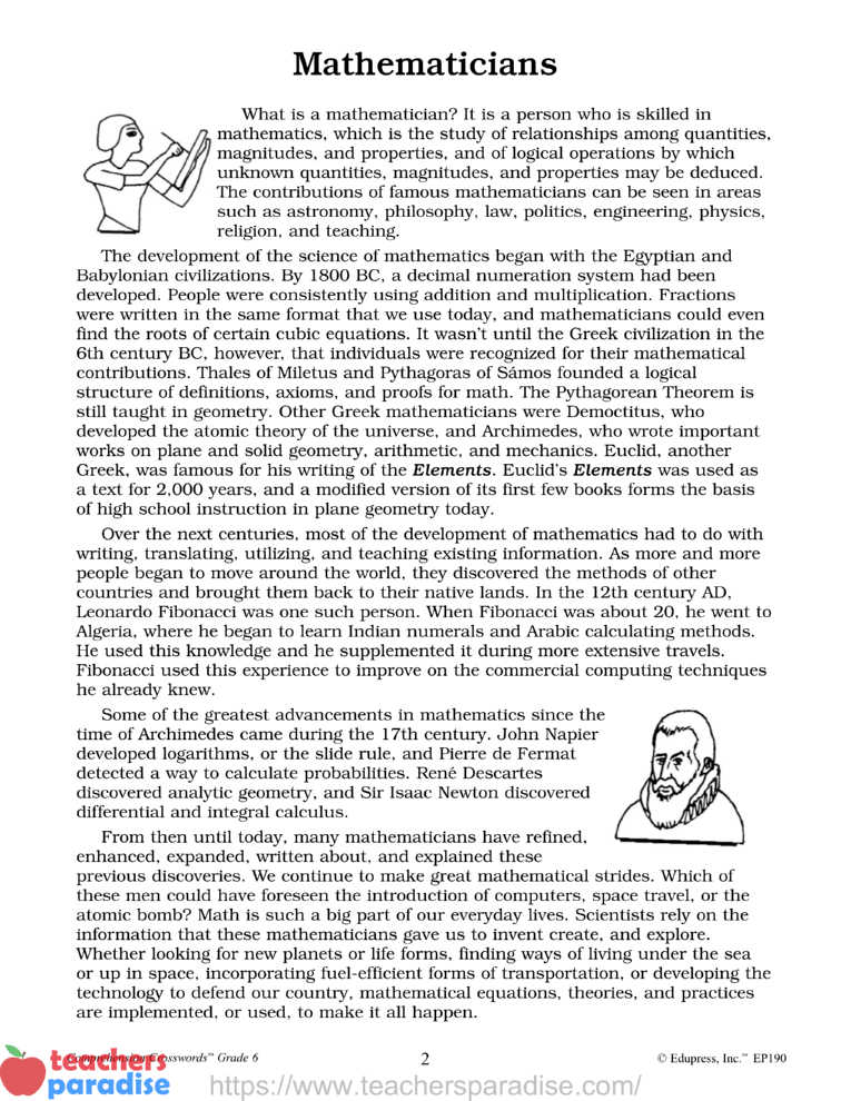 From then until today, many mathematicians have refined, enhanced, expanded, written about, and explained these previous discoveries. We continue to make great mathematical strides. Which of these men could have foreseen the introduction of computers, space travel, or the atomic bomb? Math is such a big part of our everyday lives. Scientists rely on the information that these mathematicians gave us to invent create, and explore. Whether looking for new planets or life forms, finding ways of living under the sea or up in space, incorporating fuel-efficient forms of transportation, or developing the technology to defend our country, mathematical equations, theories, and practices are implemented, or used, to make it all happen.
